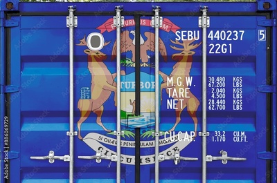 Michigan US state flag depicted on metal doors of shipping cargo container outdoors in docks area close up