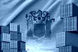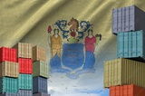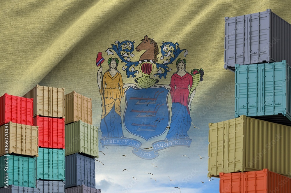 New Jersey US state flag and big stack of shipping cargo containers in docks with sky background close up