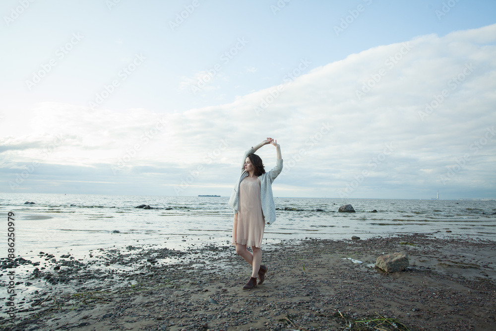 Standing healthy brunette woman with long hairstyle and fresh skin walking outdoors
