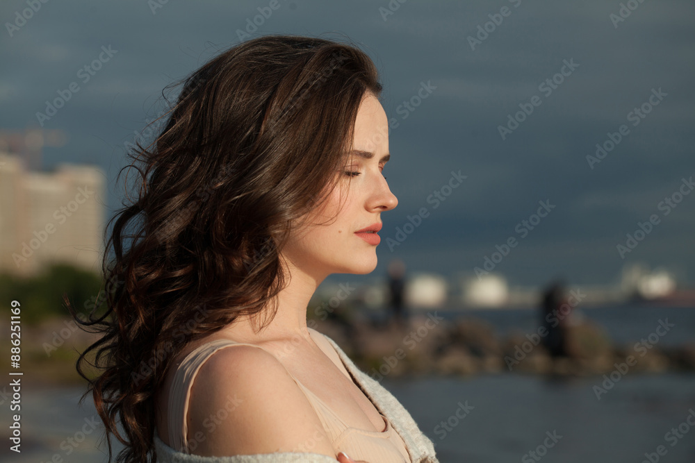 Attractive healthy brunette woman with long hairstyle and fresh skin walking outdoors