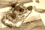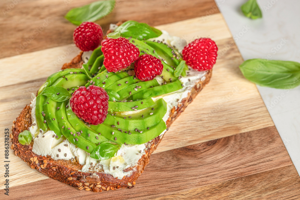 Whole wheat bread with avocado, raspberries, cream cheese and chia seeds, copy space, top view