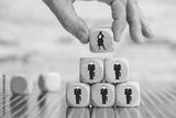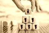 Neubesetzung einer Führungsposition im Unternehmen durch eine Frau, symbolisch dargestellt durch gestapelte und bedruckte Holzwürfel.