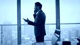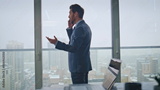 Experienced manager speaking mobile phone at big windows cabinet. Happy man call