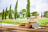Jar of honey on wooden table top with blur nature with green meadow of grass and flowers and trees. Natural field background and copy space for food and drink and products.