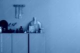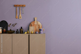 Interior design of kitchen interior with copy space, wooden cutboard, glass bottle, vase with flowers, vase with dried flowers, clock and personal accessories. Home decor. Template.