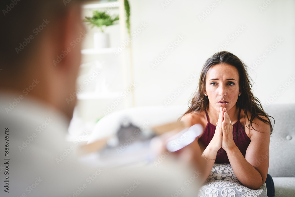 Woman with psychologist theraphy social problems concept drug addiction talk to a psychological man