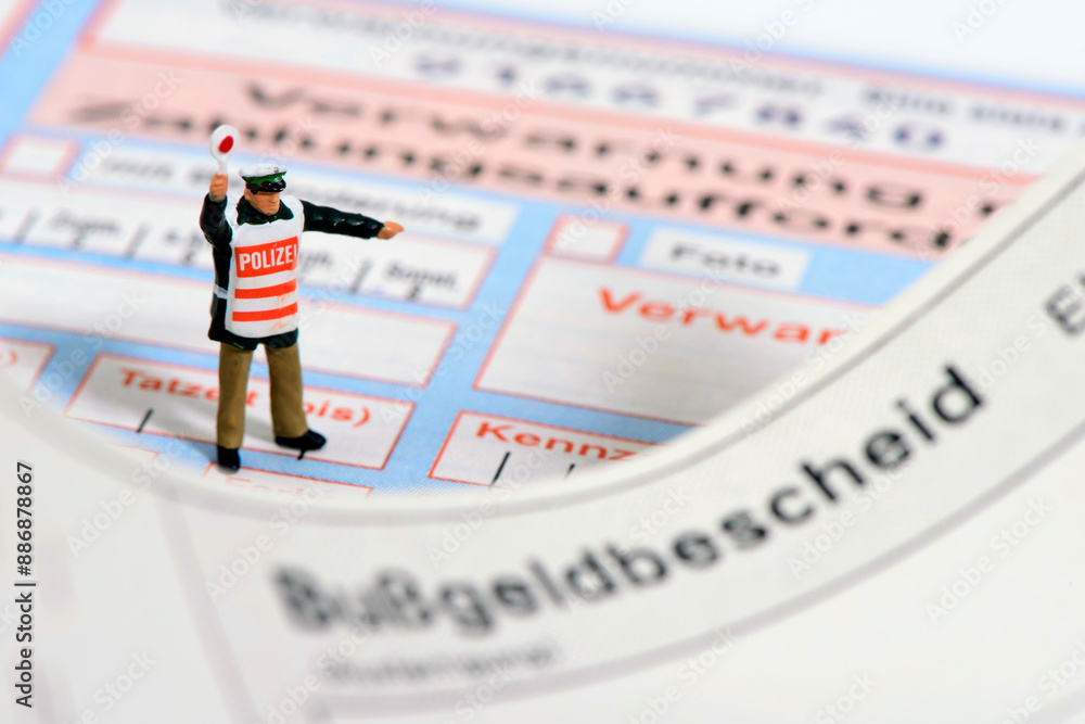 Ein Modell-Polizist steht auf einem Bußgeldbescheid und Verwarnungszettel