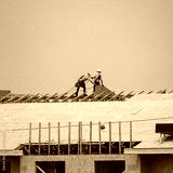 Roof construction. Roofer on roof structure. Construction Worker on Top of the Wooden House Frame. Worker roofer builder working on roof at construction site. Construction crew working on the roof.