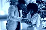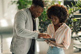 Diverse businesspeople scrolling on tablet at green corporate office.