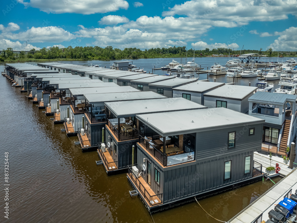 Aerial view of luxury floating homes with versatile comfort, custom layout villas with large patio, work space, dining area, living room, custom built dock