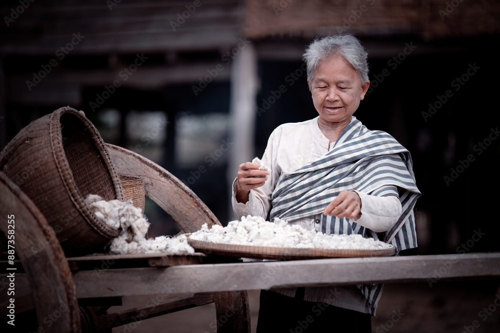 Happy Elderly woman working with cotton. She is wearing traditional clothing, including a striped shawl, and appears to be sorting or handling raw cotton is people village environment lifestyle.