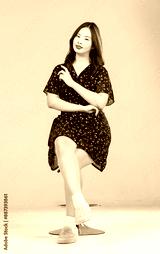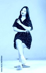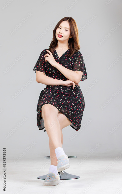 Portrait of Asian cute cheerful young girl wearing small flower pattern color black dress, stylish model woman happy sweet smile sitting chair isolated on white background, Teenage and youth fashion.