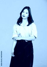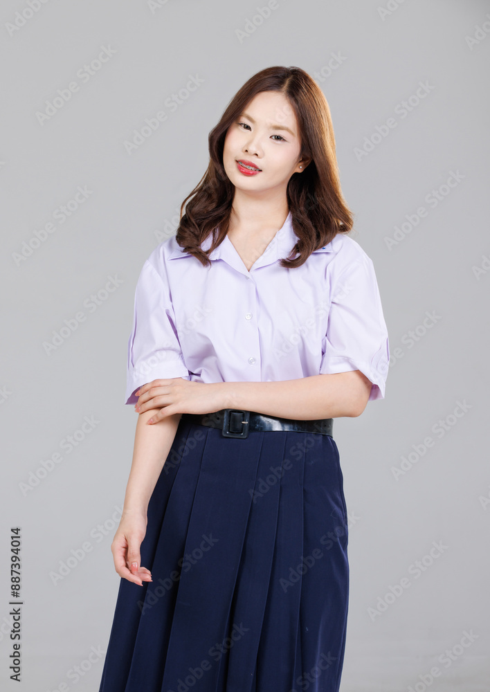 Happy asian cute cheerful young student girl wearing a school uniform, smiling posing isolated on a white background portrait studio shot, education concept.