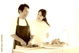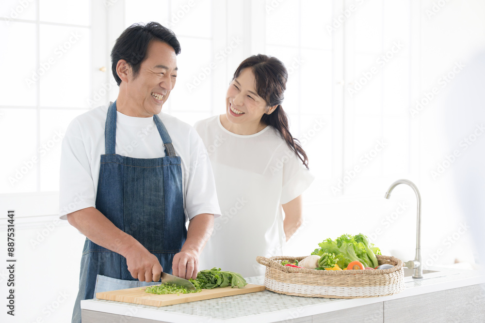 50代の夫婦で楽しくキッチンで料理する様子 夫の休日の料理