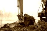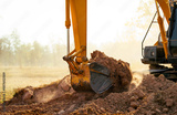 Backhoe working by digging soil at construction site. Crawler excavator digging on demolition site. Excavating machine. Earth moving machine. Excavation vehicle. Construction business.