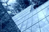 Eco-friendly building in modern city. Sustainable glass office building with trees for reducing carbon dioxide. Office building with green environment. Corporate building reduce CO2. Net zero emission