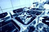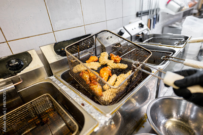 A commercial kitchen deep fryer cooks chicken pieces, highlighting professional food preparation