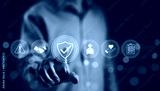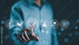 Work Safety and Compliance Concept, Safety First, A person with work safety and compliance icons, including a shield, hard hat, checklist, workplace safety, health protocols, and regulatory compliance