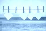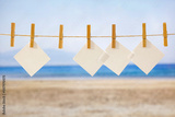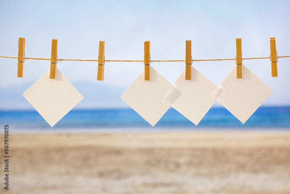 Wooden clothespins and starfish hanging on a string. Copy space for products and objects display montage with beach and seascape background. Summer concept.