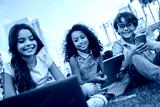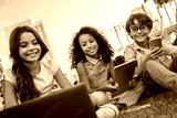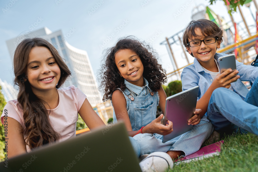 Close up of group of multiethnic elementary middle school children kids pupils classmates sitting on playground grass looking at laptop computer screen using wireless gadgets for homework