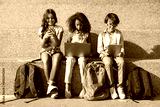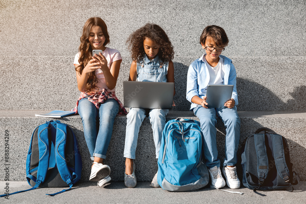 Smiling school children kids elementary middle school pupils schoolmates sitting with backpacks digital devices using gadgets laptop tablet smartphone at the street during break
