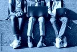 Cropped image of school kids preteen boys and girls elementary middle pupils sitting on the stairs and using digital devices wireless gadgets laptop tablet smartphone outdoors at the street