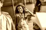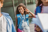 Cute happy african child preteen girl elementary middle school pupil in casual clothes with backpack going to school lessons home with fun showing peace sign gesture together with friends
