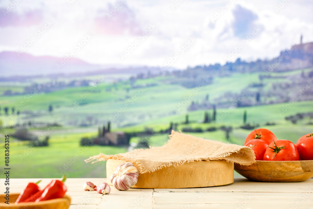 Empty wooden cutting board on and wooden table background with copy space for food and products. Image for montage objects display. Green ladscape of big green garden fields in distance.