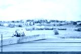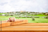 Blurred beautiful Tuscany countryside houses and green fields and gardens background. Wooden table background with copy space for products and food and for montage objects display.