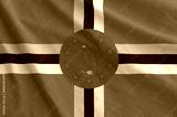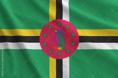 Dominica flag depicted on folded wavy fabric of old cloth close up