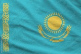 Kazakhstan flag depicted on folded wavy fabric of old cloth close up