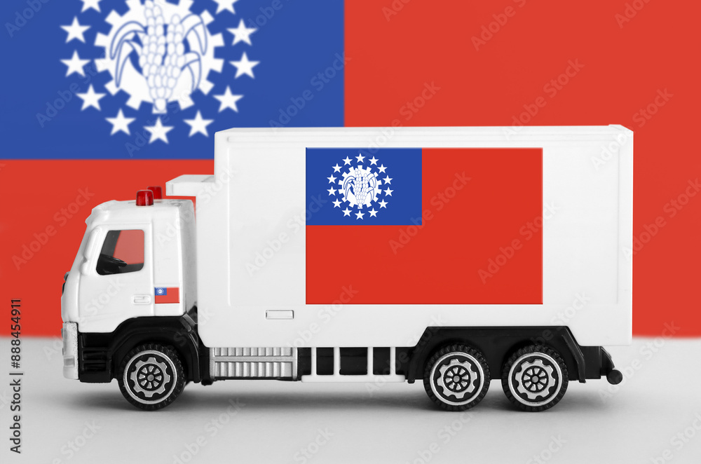 Myanmar flag depicted on side wall of white delivery van close up. Shipping and local delivery concept