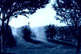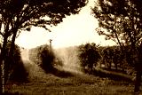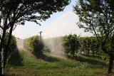 Water irrigation system in function on a green Pinot vineyard against sunlight on summer in italy