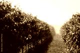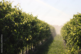 Water irrigation system in function on a green Pinot vineyard against sunlight on summer in italy