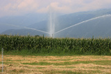 Agricultural irrigation system watering green corn field on sunny summer day in the northern italian countryside with mountains background