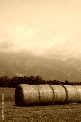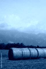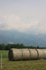 Green hay bales in rows in the mowed meadow against blue sky in the italian countryside on summer