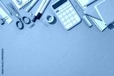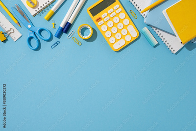 Flat lay of school supplies including calculator, scissors, and notebooks on a blue background