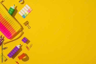 A flat lay of colorful school supplies including a pencil case, pens, paper clips, glue, and sticky notes on a yellow background