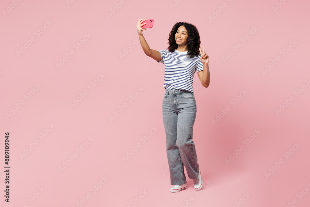Full body smiling happy fun little kid teen girl wears blue striped t-shirt casual clothes do selfie shot on mobile cell phone show v-sign isolated on plain pastel pink background. Childhood concept.