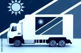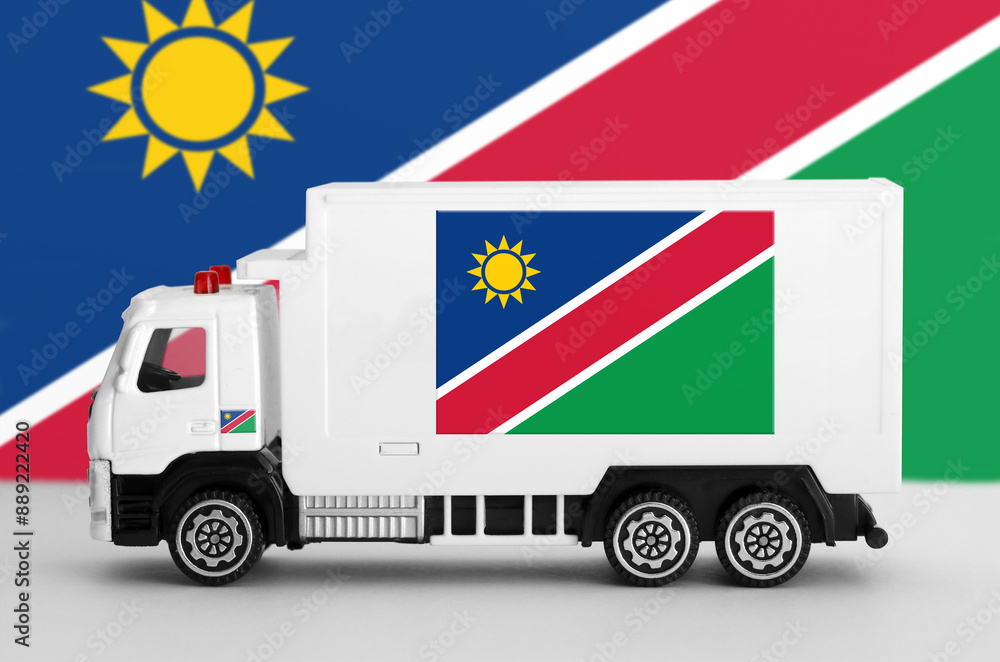 Namibia flag depicted on side wall of white delivery van close up. Shipping and local delivery concept
