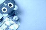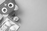Top view of back to school supplies including a cute owl backpack, yellow sneakers, colored pencils, a notebook, and an apple