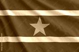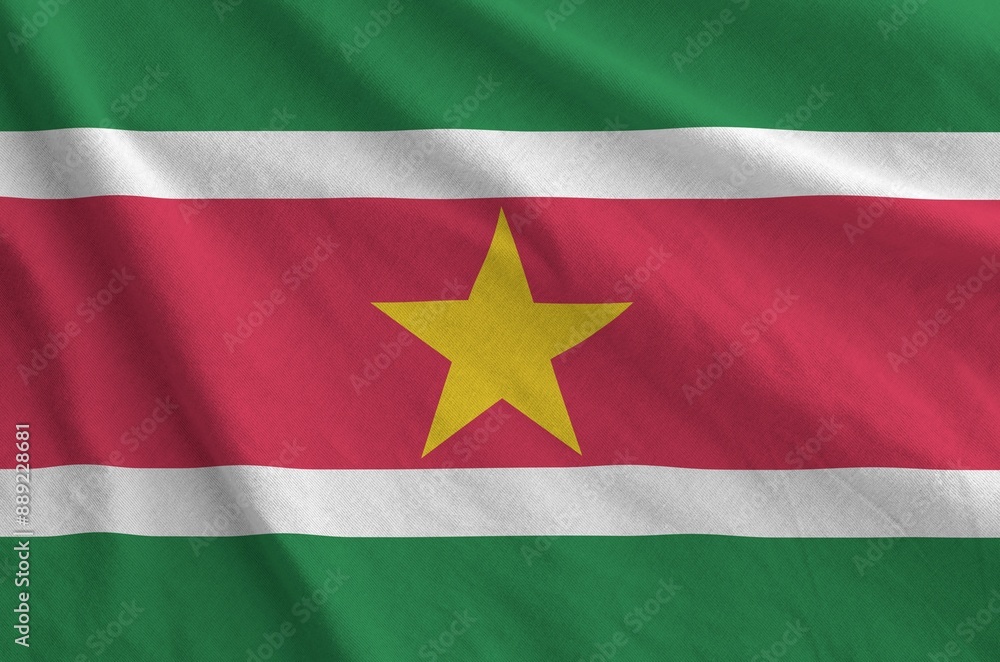 Suriname flag depicted on folded wavy fabric of old cloth close up