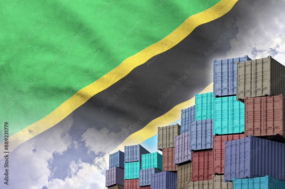 Tanzania flag and big stack of shipping cargo containers in docks with sky background close up