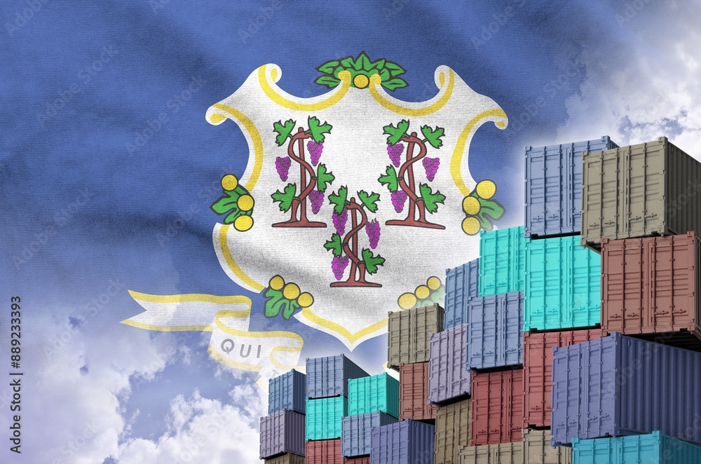 Connecticut US state flag and big stack of shipping cargo containers in docks with sky background close up