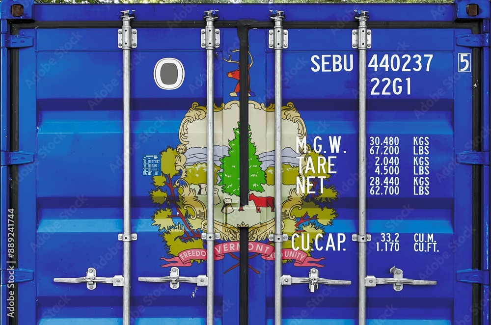 Vermont US state flag depicted on metal doors of shipping cargo container outdoors in docks area close up