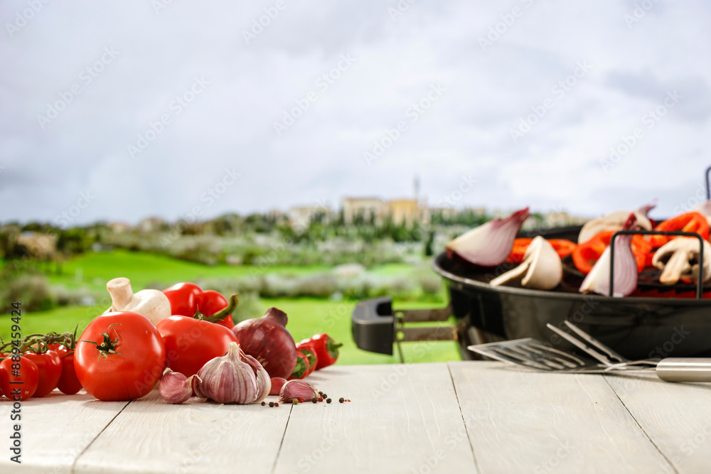 Blurred green fields in Tuscany background and wooden board table with griil and vegetables. Copy space for food and products. Image for montage objects display.