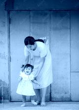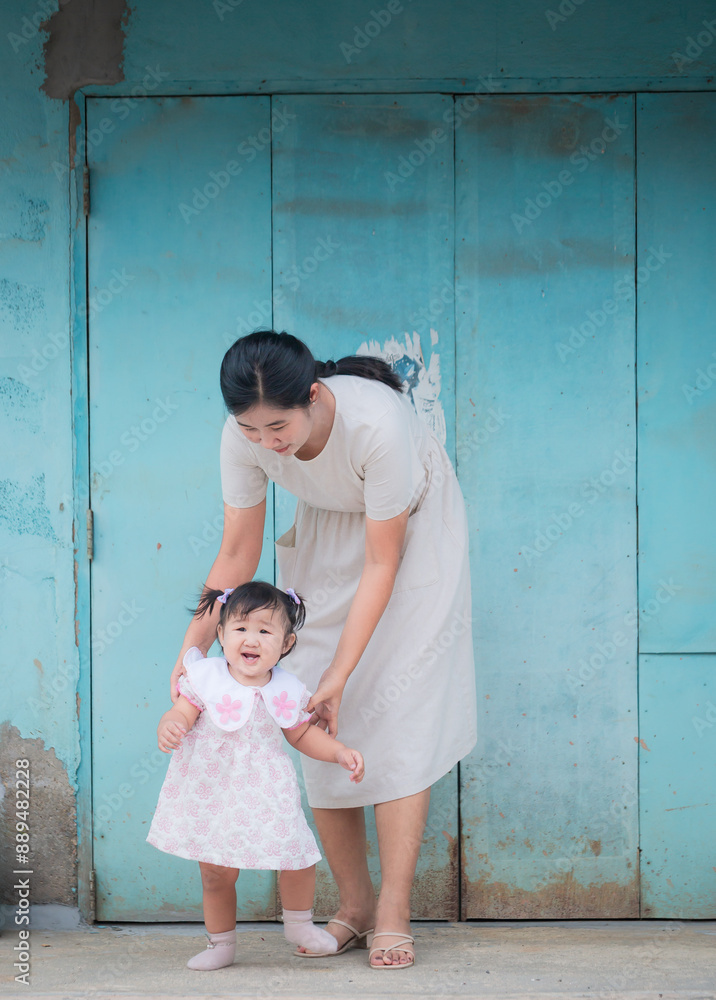 Asian mother holding her little daughter while walking,Mother and daughter, family, children, childhood and parenthood. happy little child,