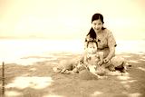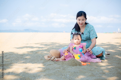 Mother and child playing in the sand on the beach,Family of mother and kids making sand castle at tropical white beach