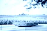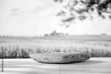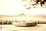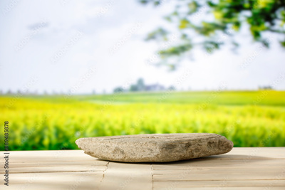 Empty stone stand on wooden board table with space for products and montage objects display. Green and yellow field in the countryside background.