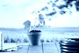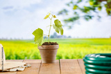 Summer garden concept and copy space for products on wooden board table top. Summer flowers and trees and green fields background and notage objects display.
